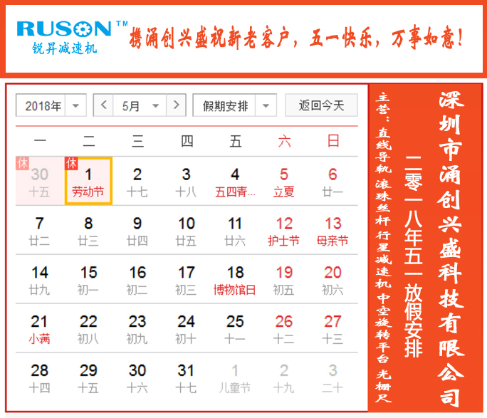 一、放假時間為2018年4月29日至2018年5月1日,共3天,于2018年5月2日正式上班。上班后,我公司的產品(直線導軌、滾珠絲桿、行星減速機、中空平臺、光柵尺)將正常供貨!