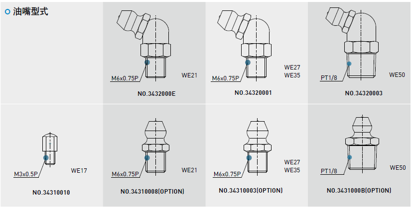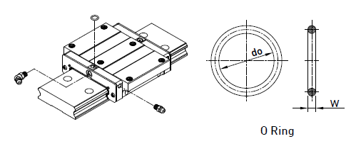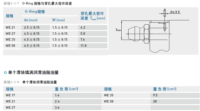 依客戶需要在滑塊前端或后端裝上油嘴以供手動打油,WE系列特別在端蓋側邊預留側油孔位置安裝油嘴(一般為直油嘴),提供側向打油,側向打油的位置建議在非側基準邊,但若有特殊需要亦可放在側基準邊。客戶如有上述側向打油需求請與我們聯絡。WE系列在端蓋頂端亦預留上油孔位置,客戶若欲從端蓋上方供油,須使用直徑0.8mm的金屬針以預熱的方式,在指定位置將上油孔穿通,再將密封環安裝于凹處即可,避免使用鉆頭穿通上油孔,碎屑有污染油道的危險。使用接管方式自動供潤滑油脂之直線導軌,則可依連接管型式選用安裝油管接頭。