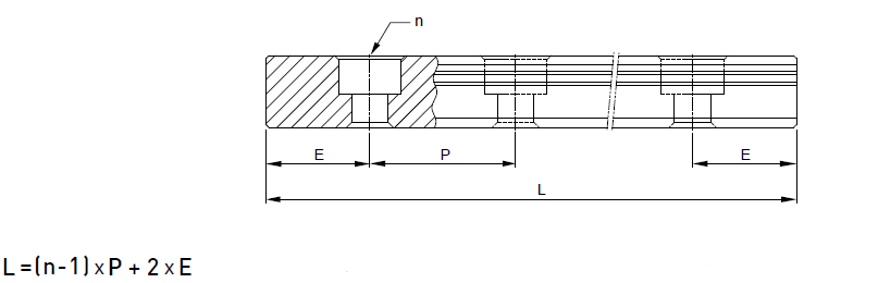 備有導(dǎo)軌標(biāo)準長度庫存,以供應(yīng)客戶需求。若客戶訂購非標(biāo)準長度導(dǎo)軌時,端面距離E的尺寸,最好不要大于1/2P,防止因E的尺寸過大,導(dǎo)致導(dǎo)軌裝配后端部的不穩(wěn)定,而降低直線導(dǎo)軌的精度,亦不可取用過小的E值 (小于Emin)以避免螺栓孔破孔。