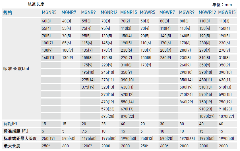 4. MGNR9不銹鋼導(dǎo)軌提供最大長度為1200 mm;MGNR9一般鋼導(dǎo)軌提供最大長度為1000 mm。