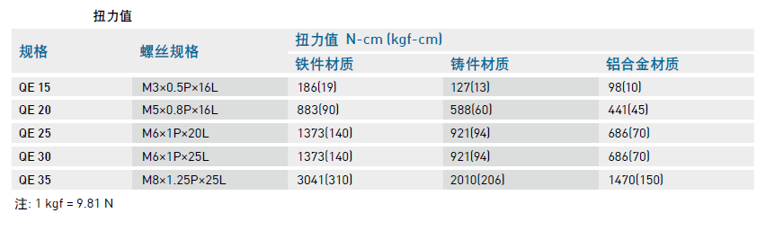 導軌裝配螺絲之扭力值安裝導軌時是否鎖緊貼平基準面影響直線導軌精度甚劇,因此為達到每顆螺絲都能鎖緊的目的,建議使用下列扭力值鎖裝配螺絲。